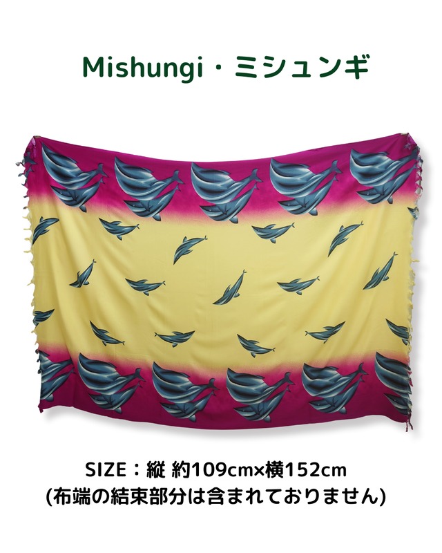 ミシュンギ は、綿素材でできたパレオのような柔らかくて肌触りの良いアイテムです。 デザインが個性豊かで、様々なデザインの布を楽しんでいただけます。 砂浜でのリゾートスタイルから、街中でのカジュアルコーデまで幅広く活躍します。日焼け防止のほかに、肩掛けやヘッドカバーとしても便利です。一枚持っていると、様々なシーンで重宝すること間違いなし! SIZE : 縦 約109cm×横152cm(布端の結束部分は含まれておりません) 素材: コットン100% ※実物と商品写真の色合いをできるだけ近づけるよう撮影しておりますが、照明等により色味が異なる場合がございます。 ※ゆがみや色むらがございますが、問題なくお使いいただけますのでアフリカ布の特徴としてお楽しみくださいませ。 ※商品は手洗いをおすすめします。お取り扱いにはご注意ください。