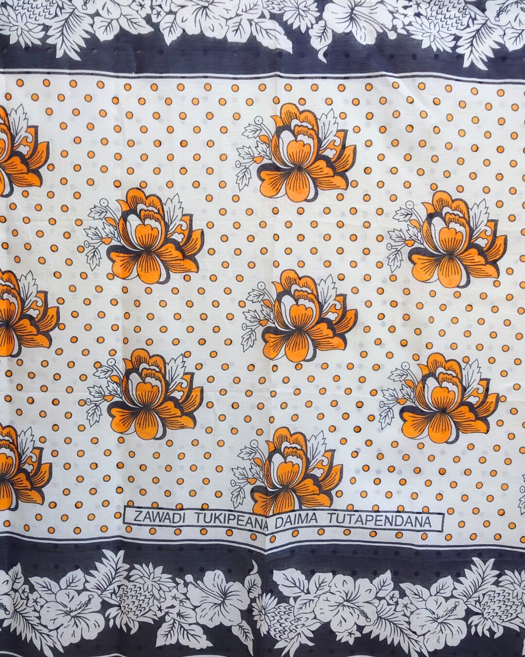 カラフルなアフリカンプリント柄、周囲には縁取りがデザインされ、カンガの特徴であるスワヒリ語のメッセージ(カンガセイイング)が描かれています。