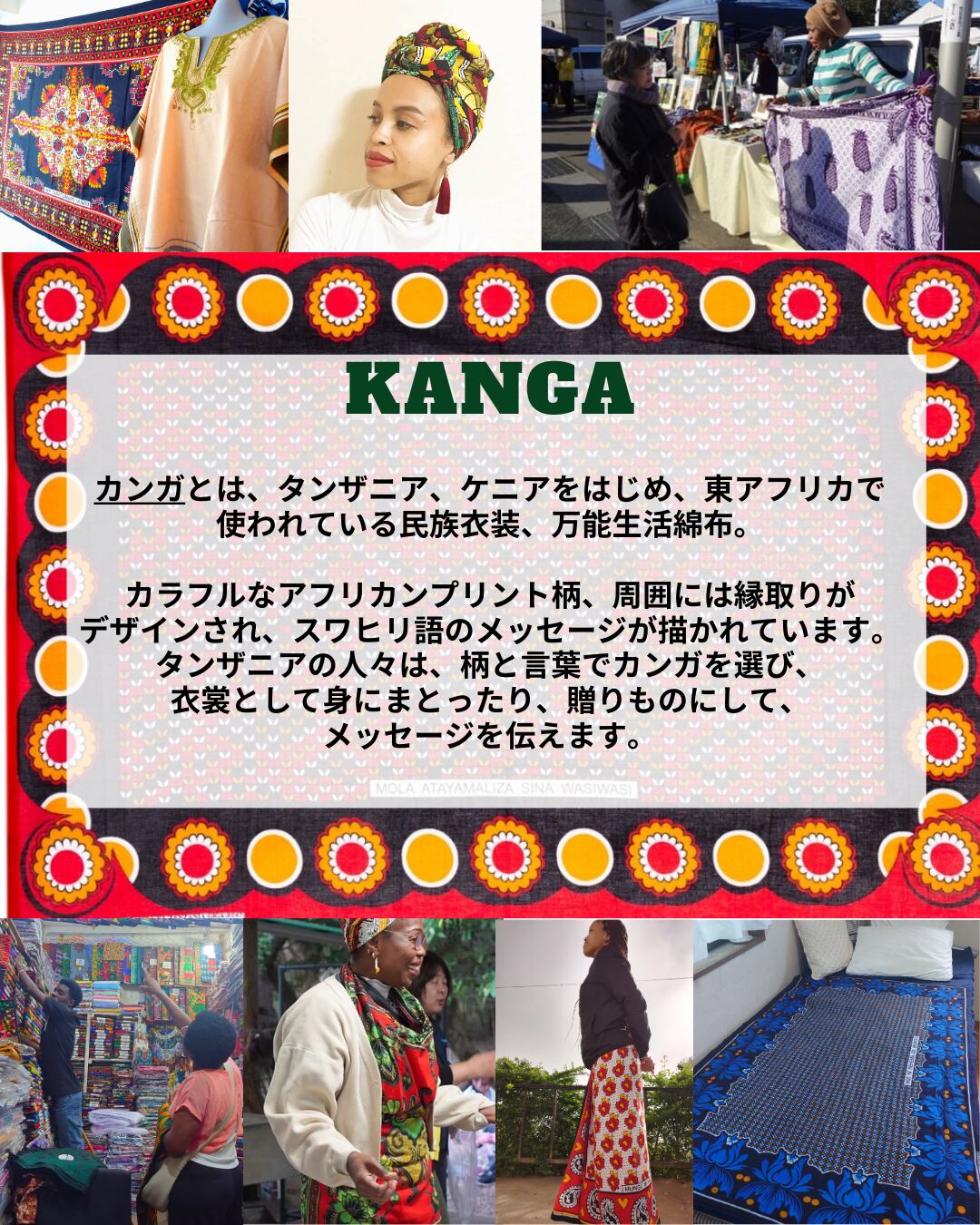 カンガ(スワヒリ語でホロホロ鳥)とは、タンザニア、ケニアをはじめ、東アフリカで使われている民族衣装です。