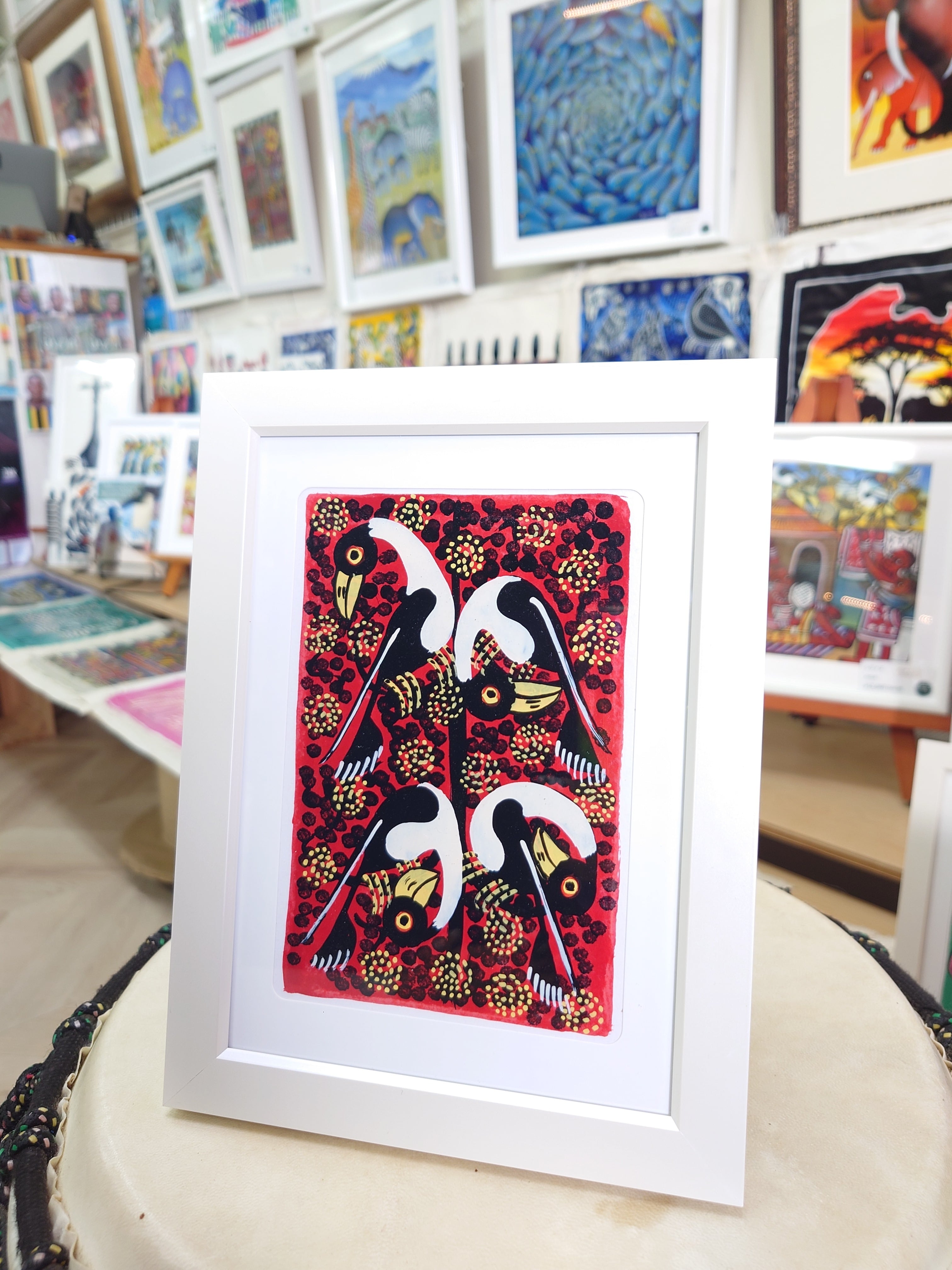 アフリカンポップアートの魅力を手軽に楽しめる、ティンガティンガのはがきサイズのアート作品です。華やかな色使いと大胆なデザインが特徴で、お部屋のアクセントやギフトにも最適です。
