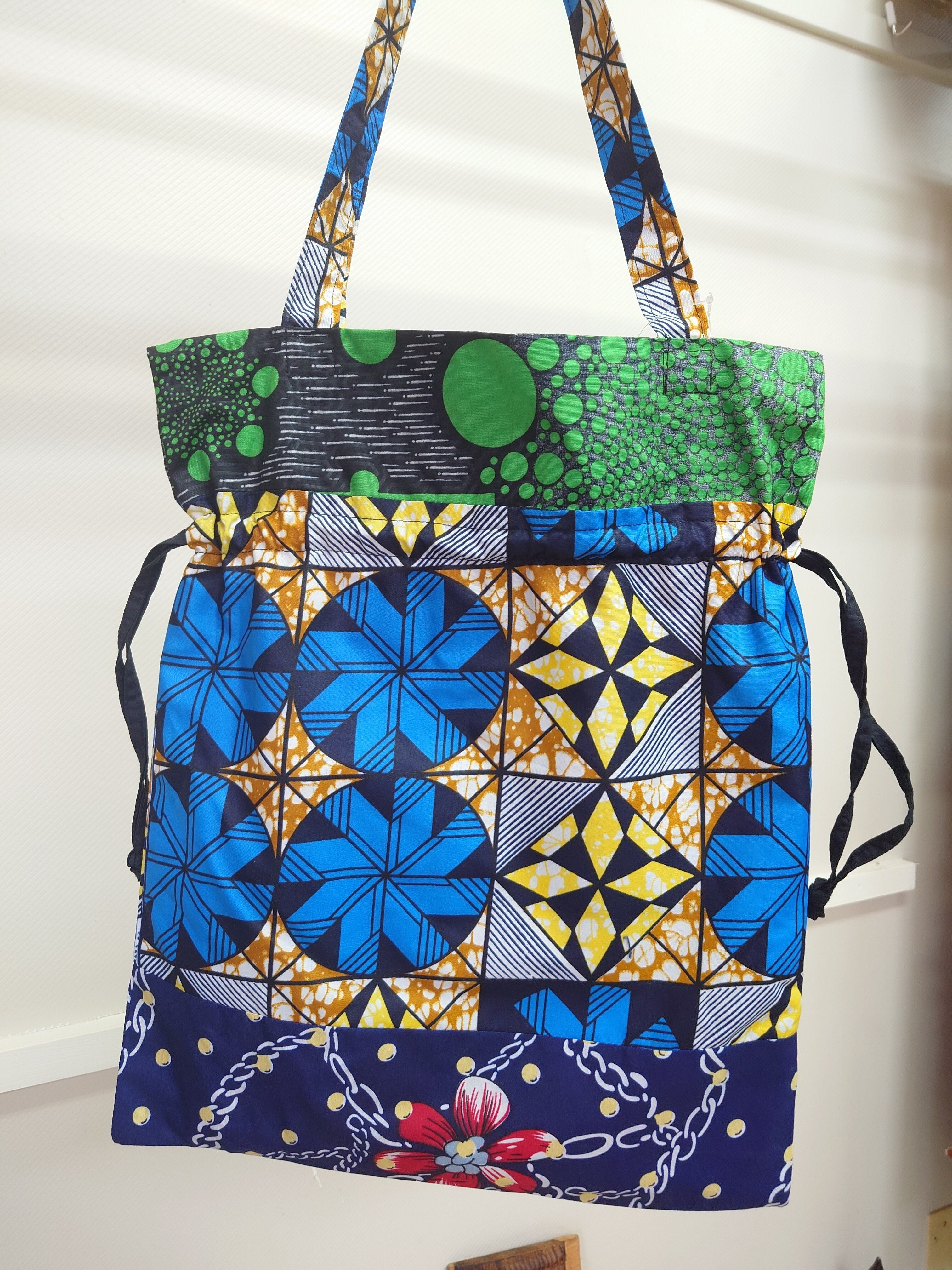 アフリカ柄をベースにしたカラフルなパッチワークデザインは、まるでアート作品のような美しさです。どんなコーディネートにも映える存在感で、まるであなただけのオリジナルバッグのような気分にさせてくれます。広々とした収納スペースは、お買い物やお出かけにもぴったり。