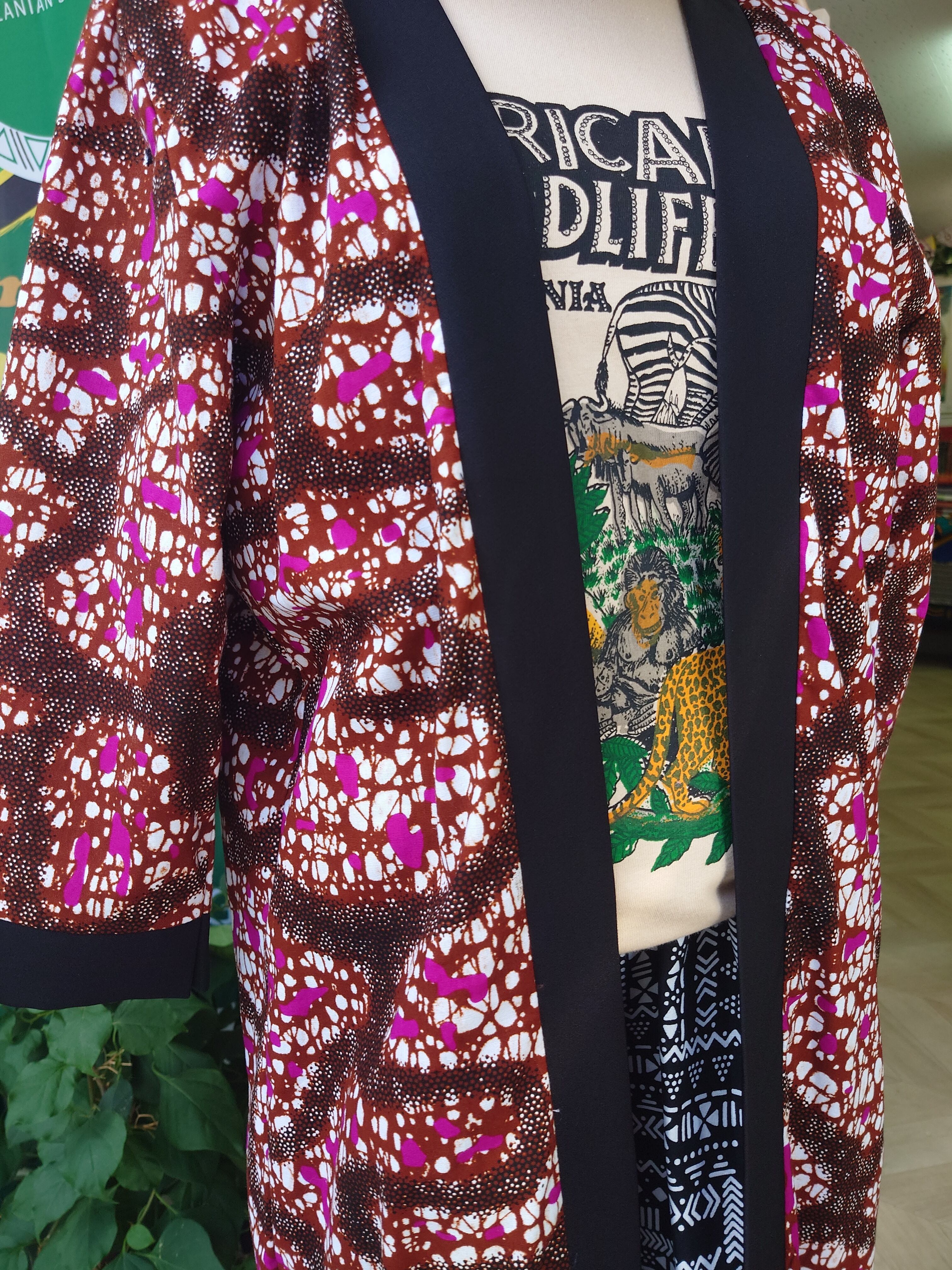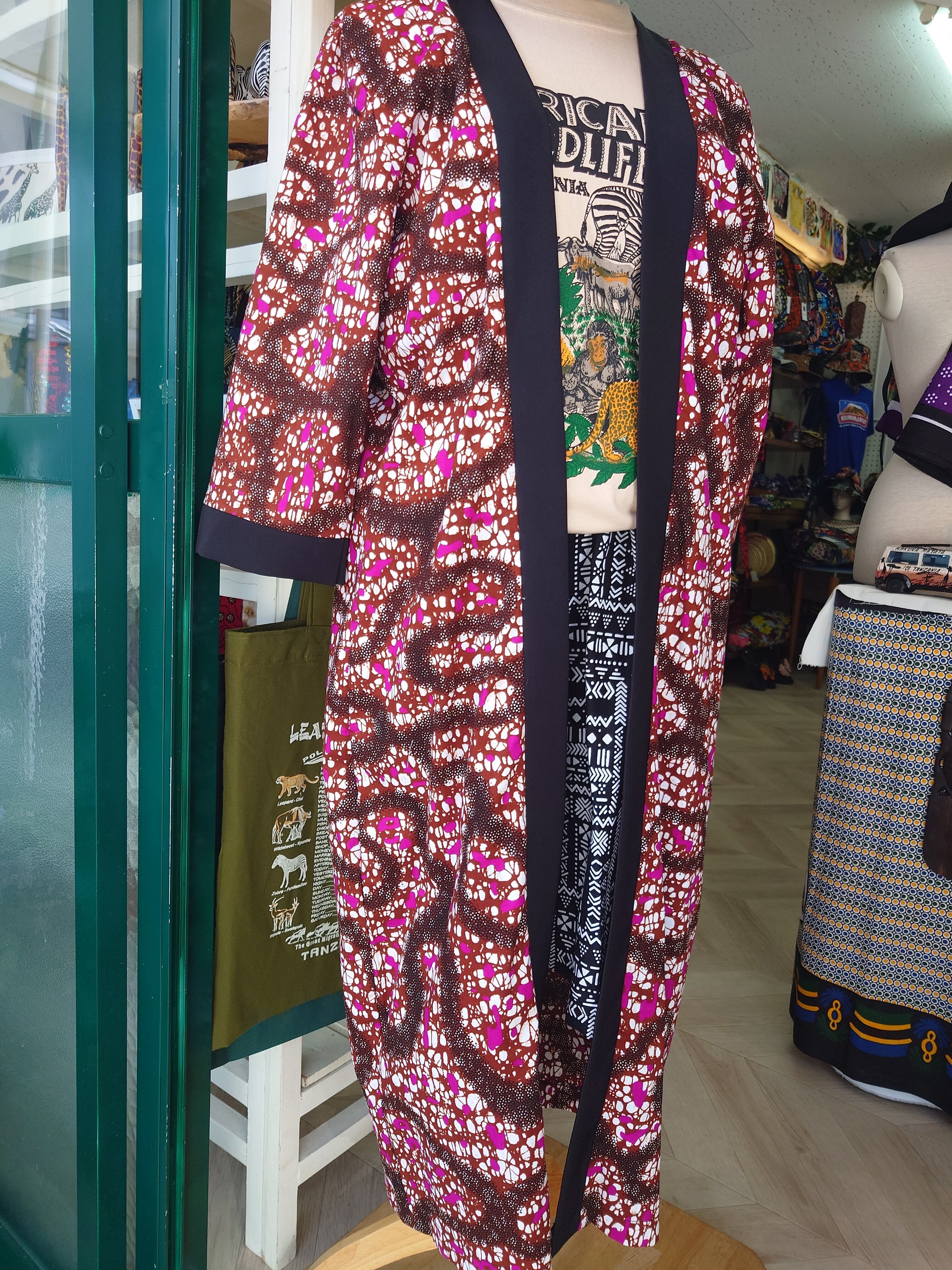 キモノカーディガンは、着物風とアフリカン布を融合させたユニークなデザインが特徴です。カジュアルなカーディガンとしても、着物のような風格も漂わせることができ、幅広いスタイリングが可能です。柔らかくて軽いキテンゲ生地を使用しており、着心地も抜群です。