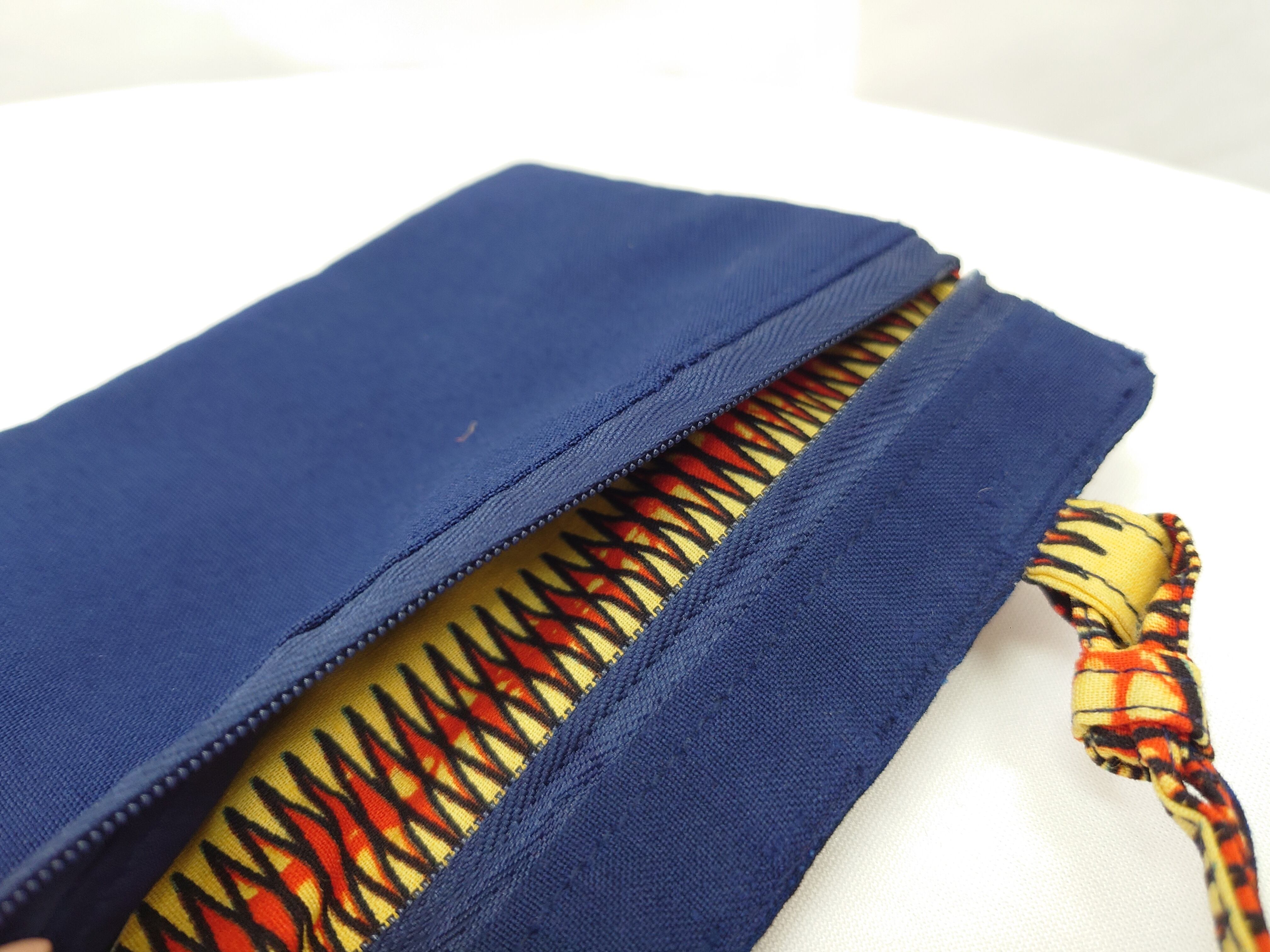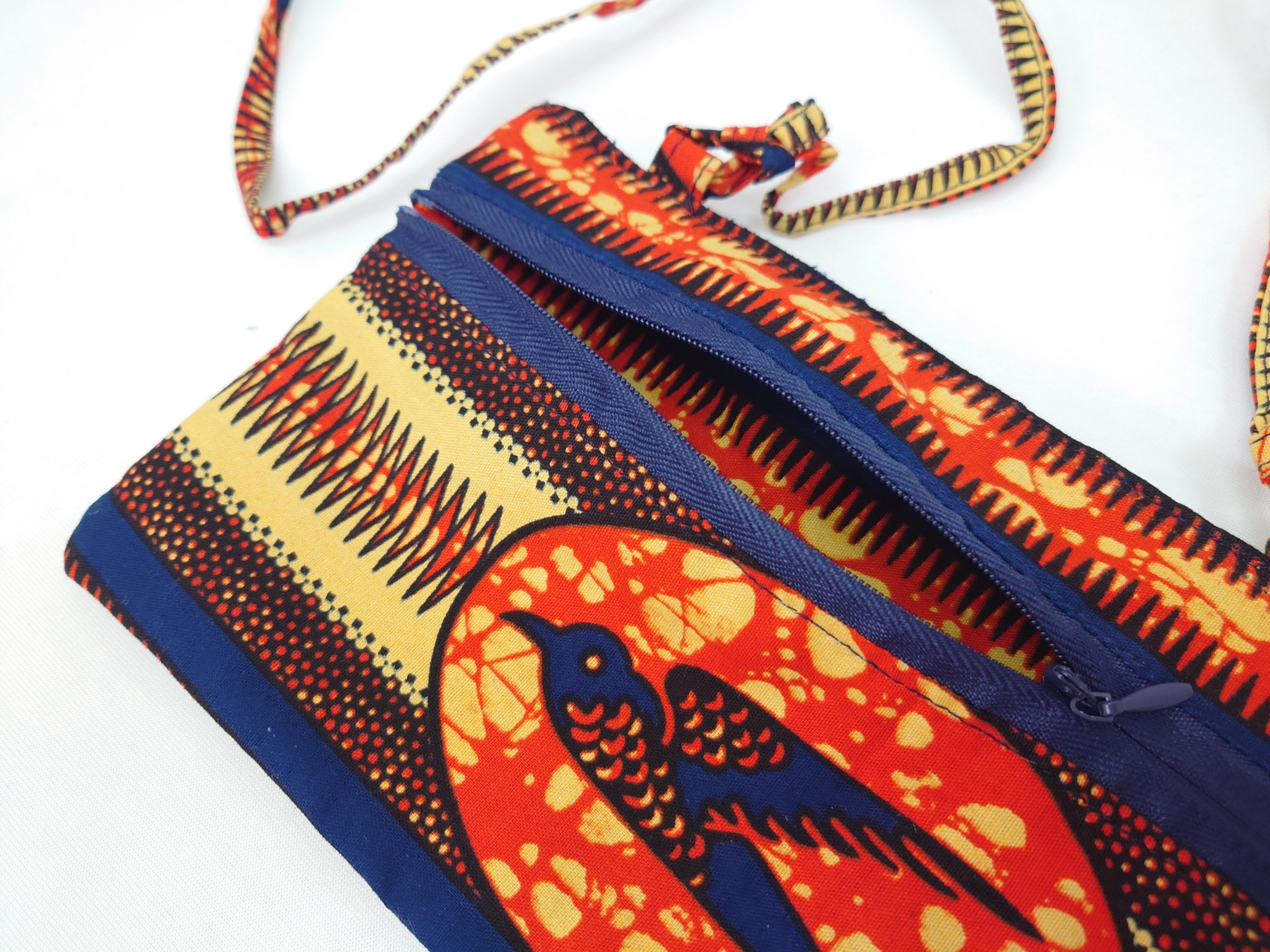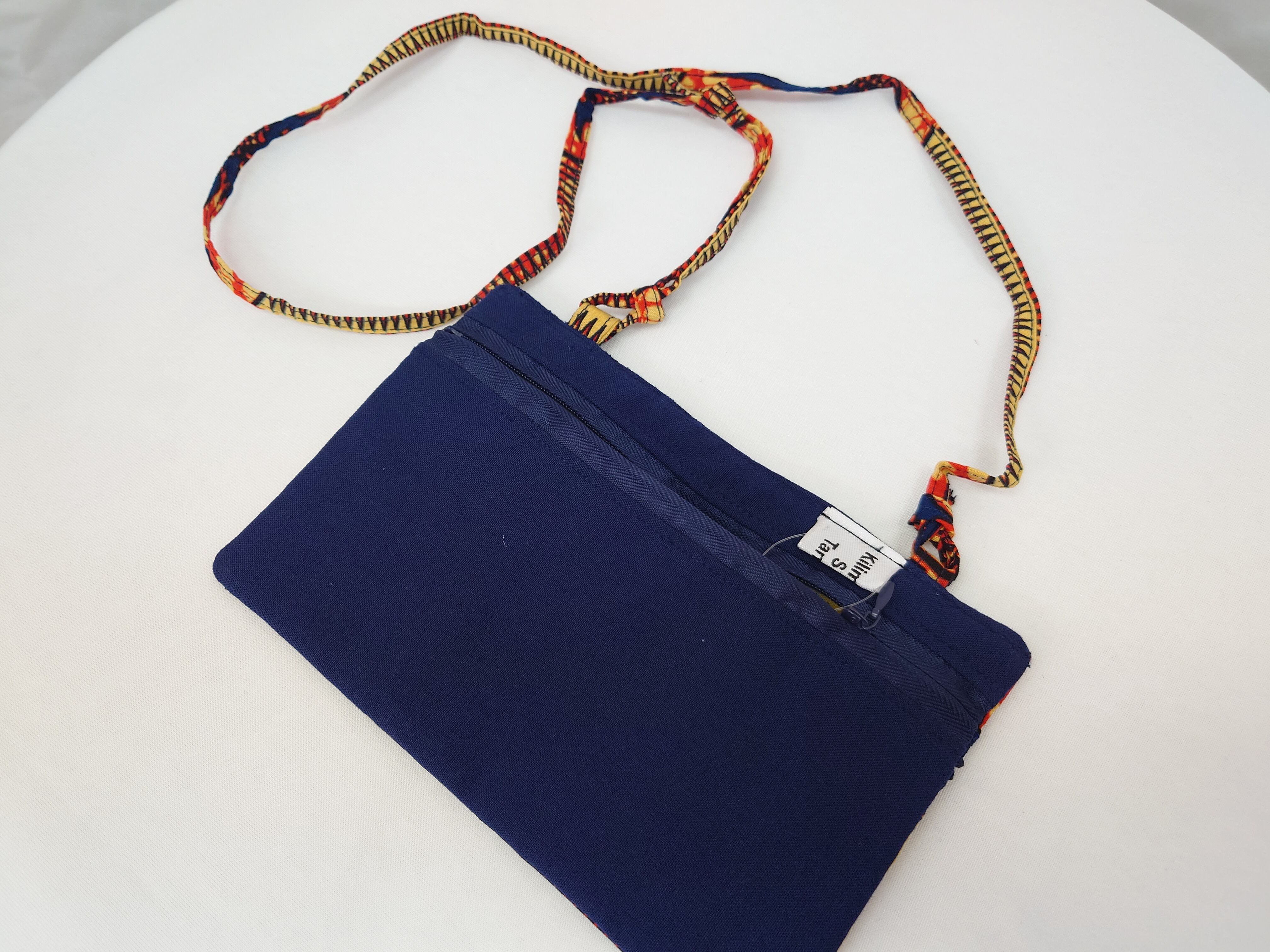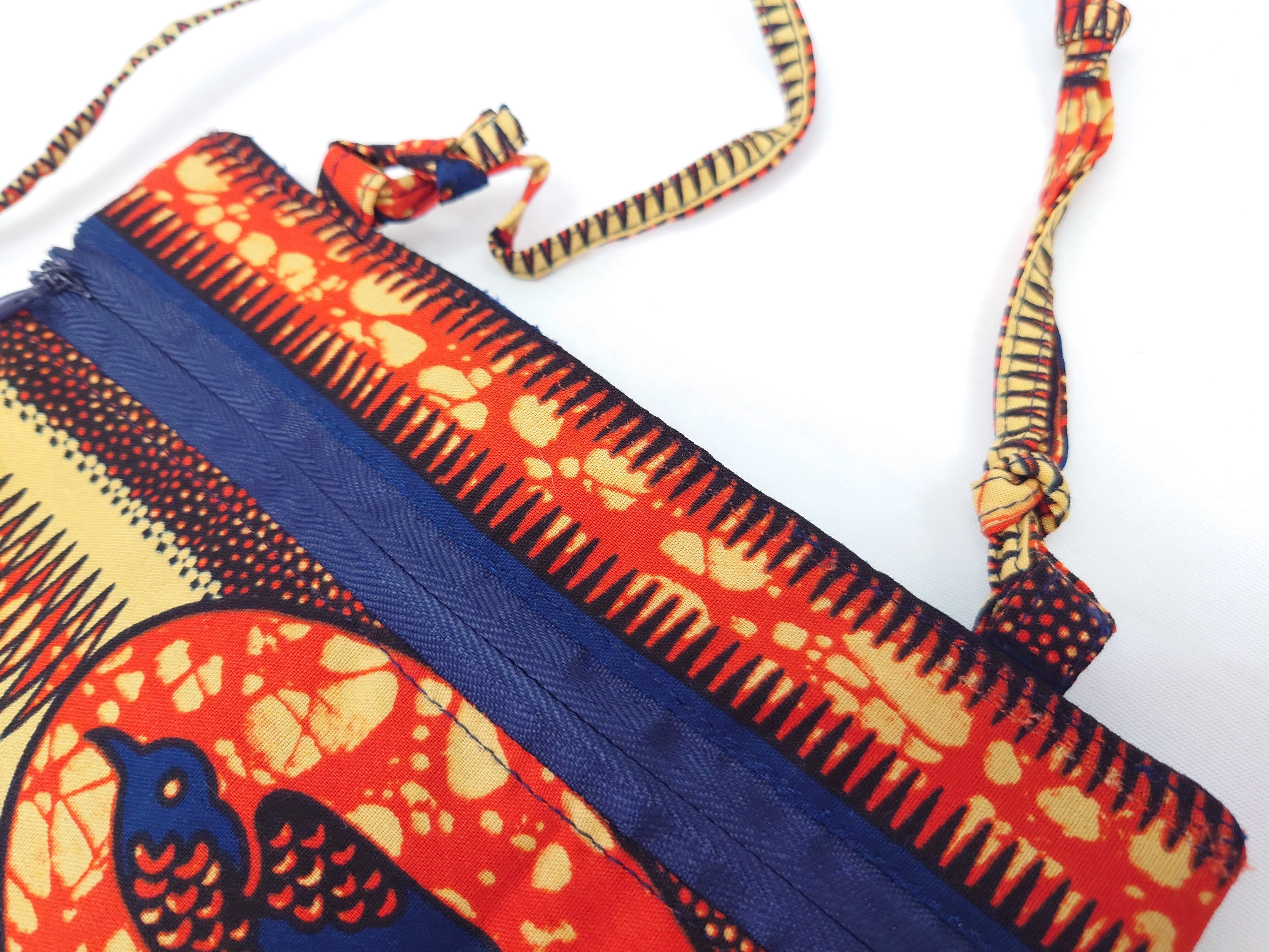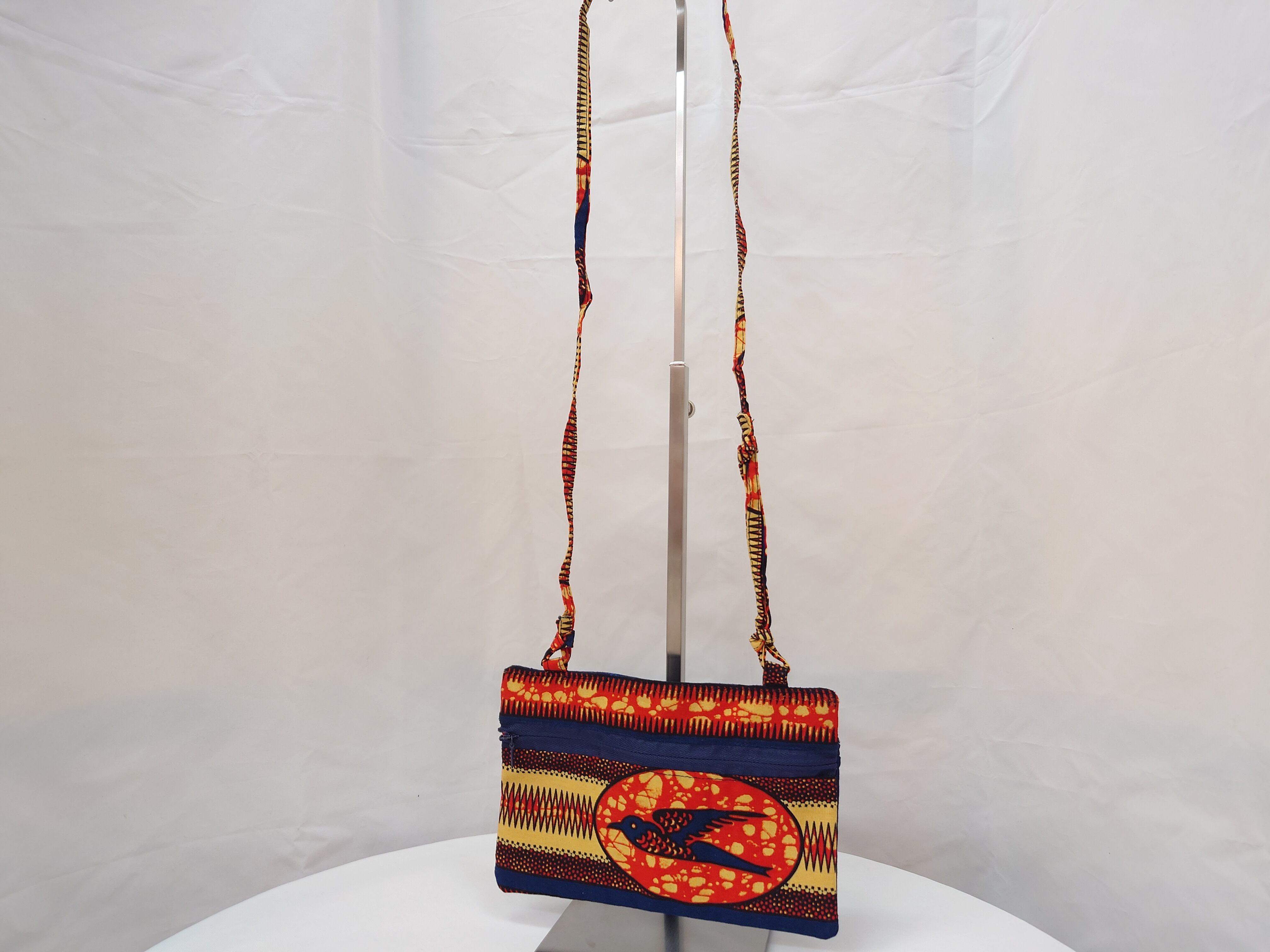 アフリカの色彩豊かなキテンゲ布を使用した、ハンドメイドのサコッシュです。鮮やかなオレンジ色が特徴のデザインで、肩ひもは調節可能なので、シーンに合わせて使いやすさ抜群です。